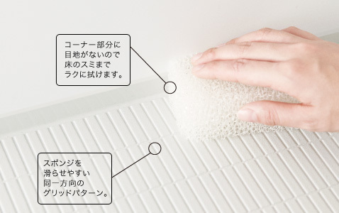 パーツを組み立てて作るユニットバスは、床と壁の隅(パッキン部分 )に汚れが溜まり、掃除する時にスポンジが届きにくいという問題がありました。