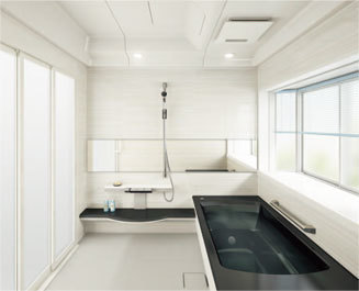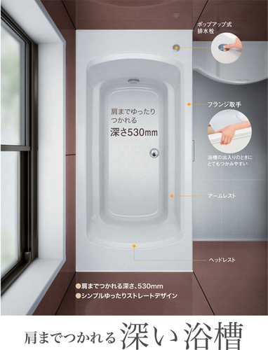 規格サイズで限られた空間でも洗い場を狭くすることなく、足を伸ばして肩までつかれる広い浴槽を実現しています。