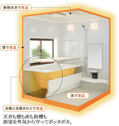 浴室の天井、壁、床、浴槽のあらゆる場所に高断熱加工を施しています。