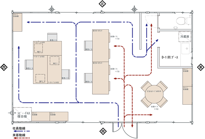 赤が来客動線、青が社員動線です。