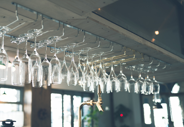 見せる収納を考えることは、店舗デザインを考えることにもつながります。 例えば、重ねて収納ができないワイングラスなどは並べて収納するとかなり場所を取りますが、バーカウンターの上部にぶら下げて収納をすれば、場所を有効活用しながらナチュラルに見せる収納が確保できます。