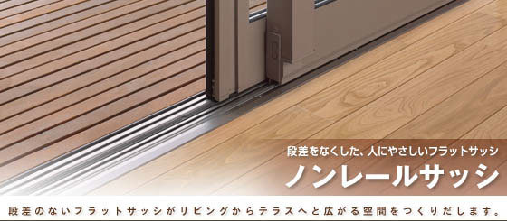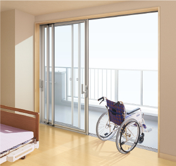 サッシの下枠の段差を無くし、さらにレールの溝も塞いだフルフラット構造のサッシです。少しの段差や凹凸も無いので、つまづいたり転倒する心配がありません。車輪の障害となる物が無いので、車椅子でもスムーズに通行することができます。