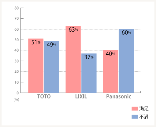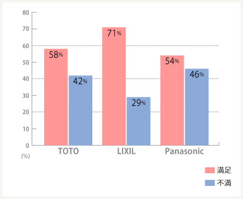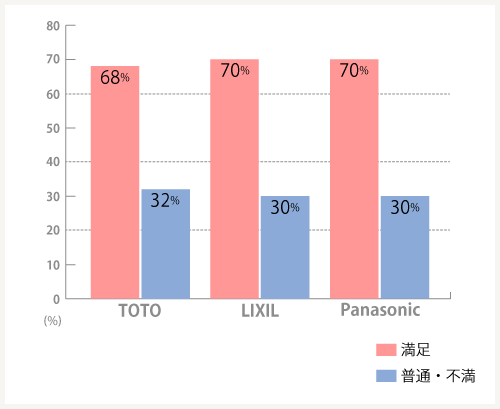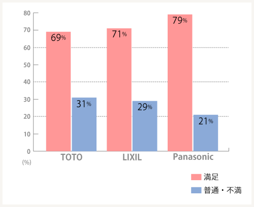 タンクレストイレについての満足度は、 LIXIL、 Panasonicが同率で1位となりました。僅差でTOTOも68%の満足度を獲得しています。全体としてタンクレストイレを使用している方々のうち、70%近くの方が満足しているということが言えそうです。