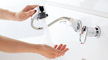 水栓にはエコ機能もついています。従来の水栓ハンドルは正面にして使うとお湯と水が混ざった状態で出ていたので、必要がない時にも無意識にお湯を使っていました。 キューボで採用されているのはエコハンドルと言い、ハンドルを正面にしておいても水だけが出ます。その結果無駄なガス料金が発生することを防ぐことができるのです。