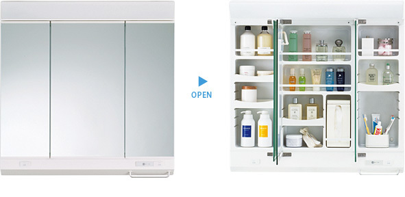 ミラーは1面鏡と3面鏡の2種類から選べます。鏡の裏側にキャビネットを搭載しているのは3面鏡タイプです。普段は鏡の裏側に小物類をしまっておき、必要な時だけ扉を開けて取り出すことができます。洗面化粧台の周りを綺麗に片付けられる上に、使い勝手も損ないません。