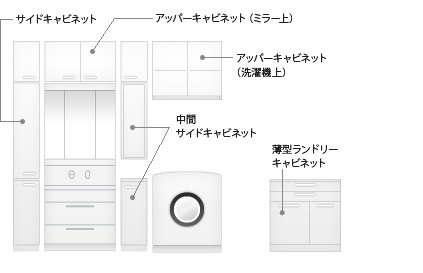 洗面化粧台周りのサイドキャビネットやアッパーキャビネットはもちろん、洗濯機の上にも設置可能なアッパーキャビネットや、薄型のランドリーキャビネットも用意されています。