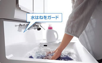 もう1つの洗面台は「ハイバックカウンター」というものです。この洗面台の優れた点は水はね用の壁が付いており、水がはねても簡単にお手入れができる設計になっています。通常の洗面ボールでしたら洗面台で洗濯等の作業をした場合には水はねしてしまいますが、ハイバックカウンターならそのような心配はありません。様々な使用方法に対応した洗面台と言えます。