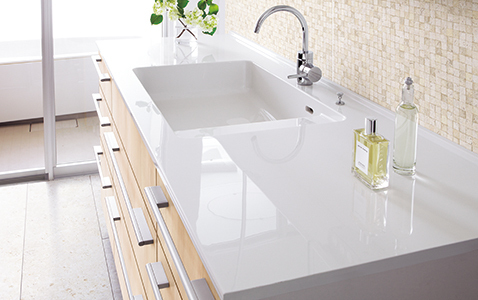 この有機ガラス系新素材は水あかをはじくので、汚れがつきにくくなっています。タオルやペーパーでサッと一拭きしてしまえば、あっという間に綺麗になります。お掃除の手間が省ける頼もしいカウンターです。